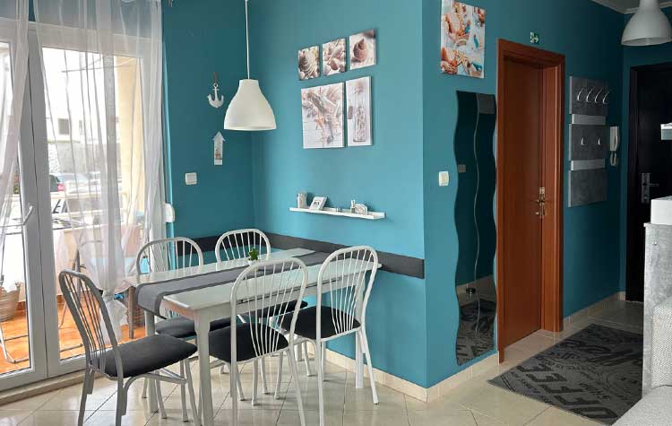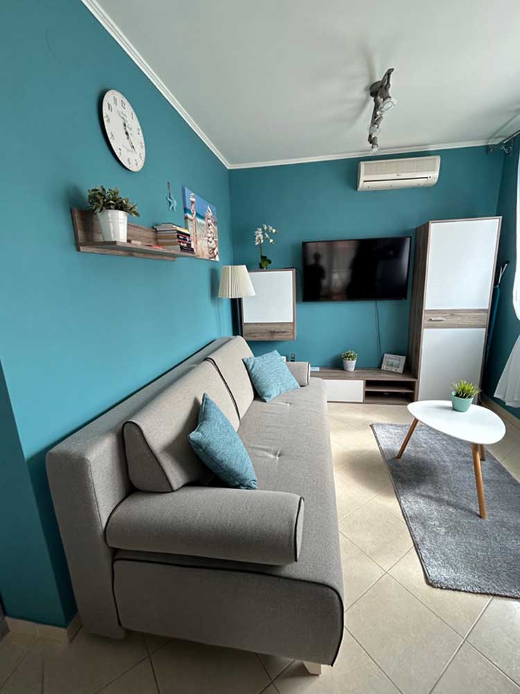 2+2 főt és egy kisgyermeket tudunk elszállásolni. A víz sekély, aprókavicsos, homokos, kisgyermekes családoknak ideális. Apartmanunk egy apartmanház magas földszintjén található , egy szoba,nappali modern